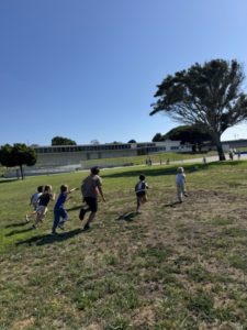 プールから学校へ戻った後は、広大な校庭で現地の子どもたちと交流し、アメリカの小学校のスケールの大きさに驚きました。