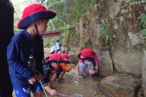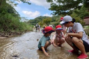 小さな魚を見つけたお友だち、「この川はカニがいるよ!」と教えてもらいカニを一生懸命探したりと