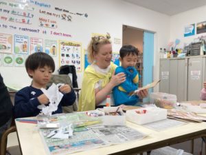 アート&クラフトでは、簡単な動詞や文房具に関する英語表現に自然な文脈で触れながら、子どもたちの自発的な発話が促されます。
