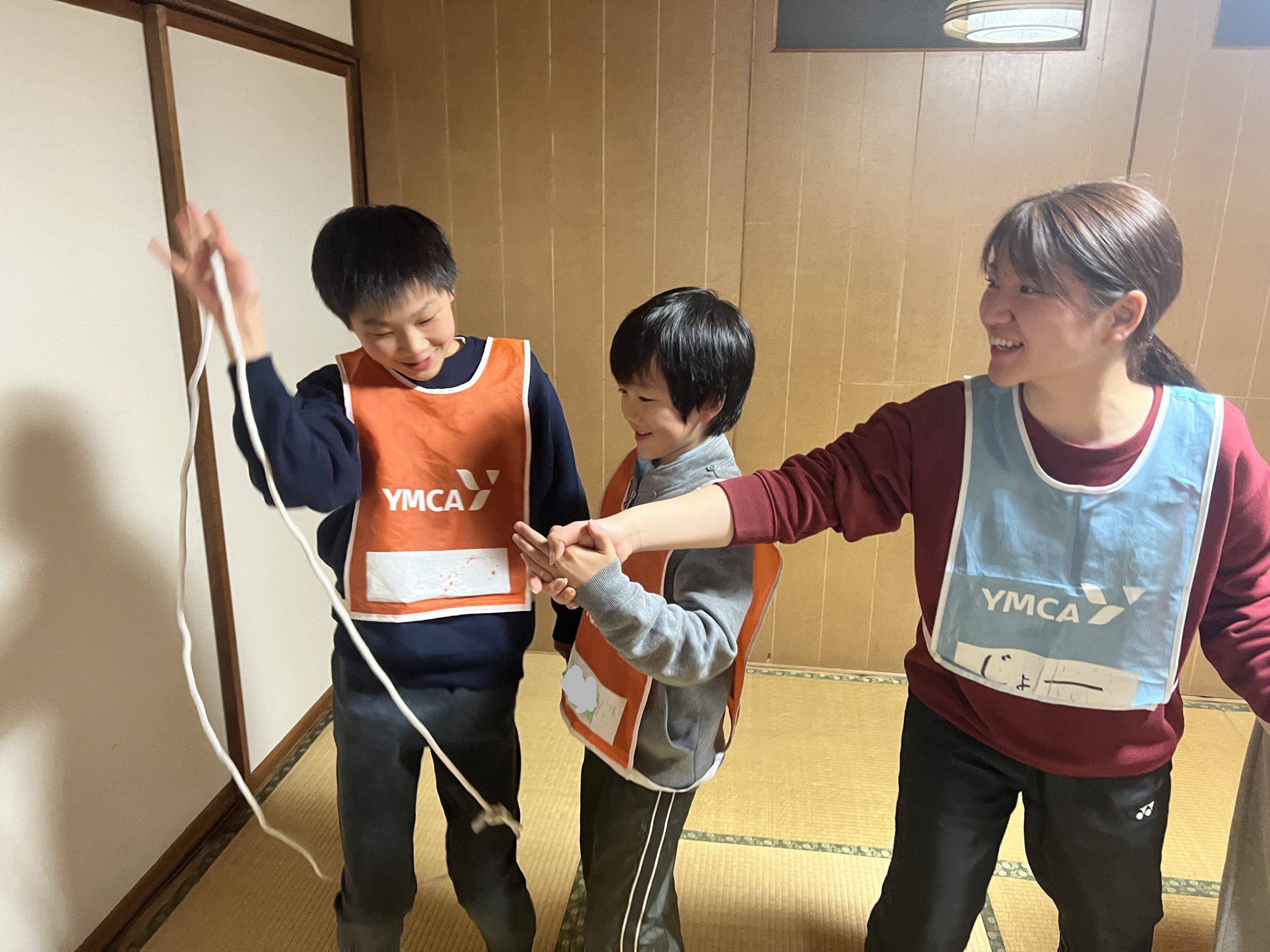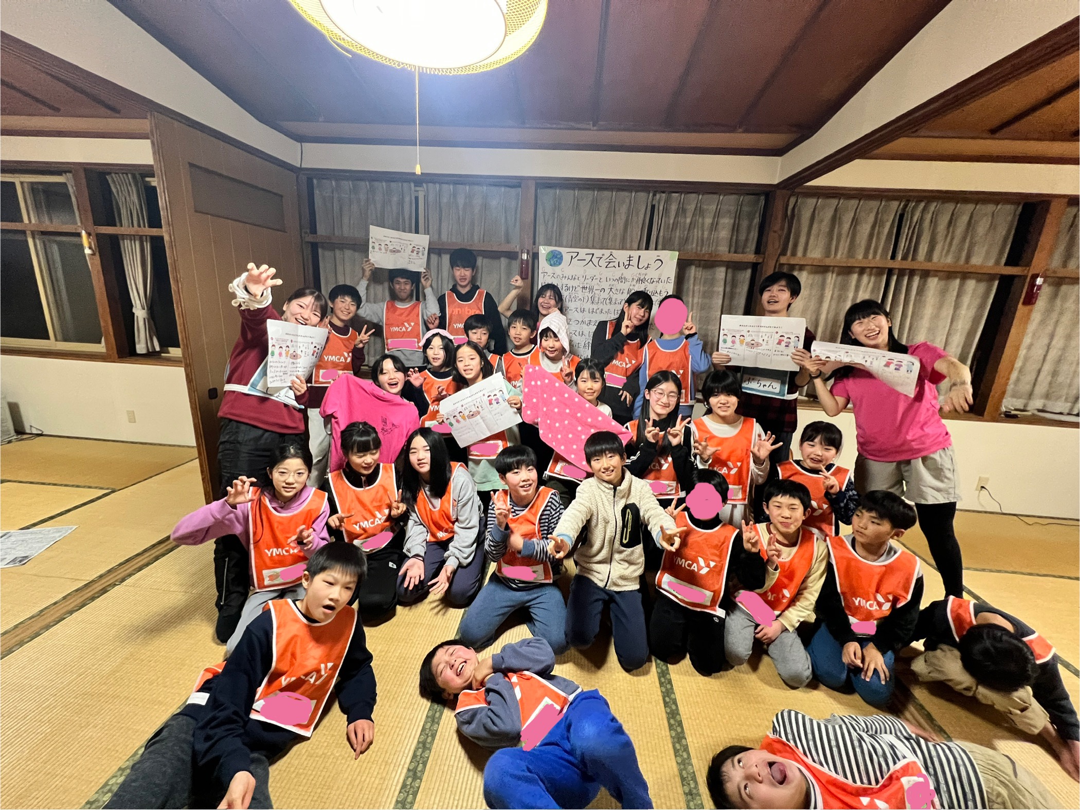 1日目の夜には宿の広い部屋でレクリエーションを行いました。普段一緒に活動しているグループではなく他学年混合のチームに分かれて、チーム対抗戦レクリエーションを開催!!約1年間共にしたアースの仲間で、初めは他学年混合チームに戸惑う様子もありましたが、ゲームが始まるとすぐに打ち解けてすっかりチーム意識が芽生えていました。体や頭を使ったゲームに一生懸命にとりくみ、年齢の壁を取り払う良い時間が流れていました。