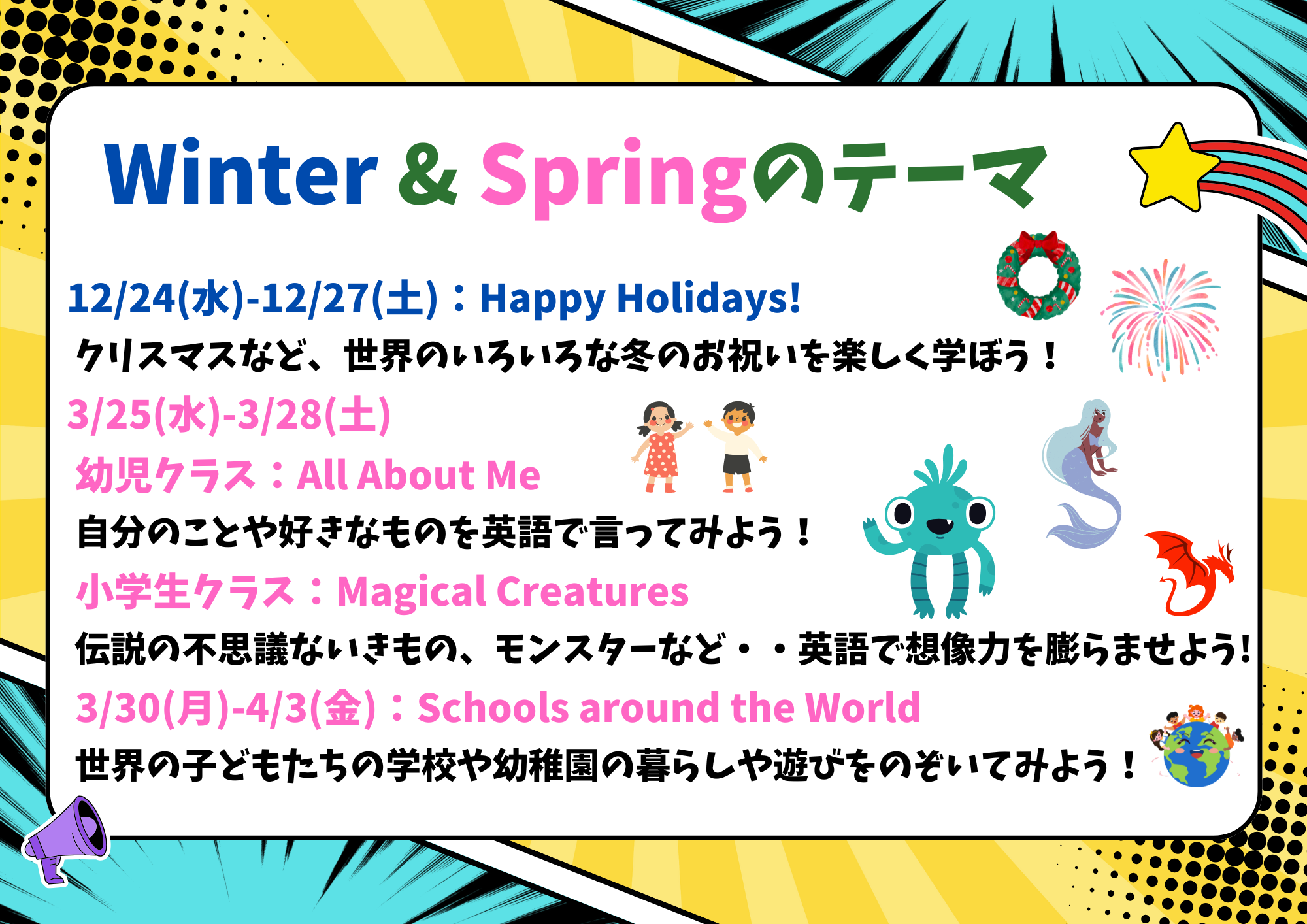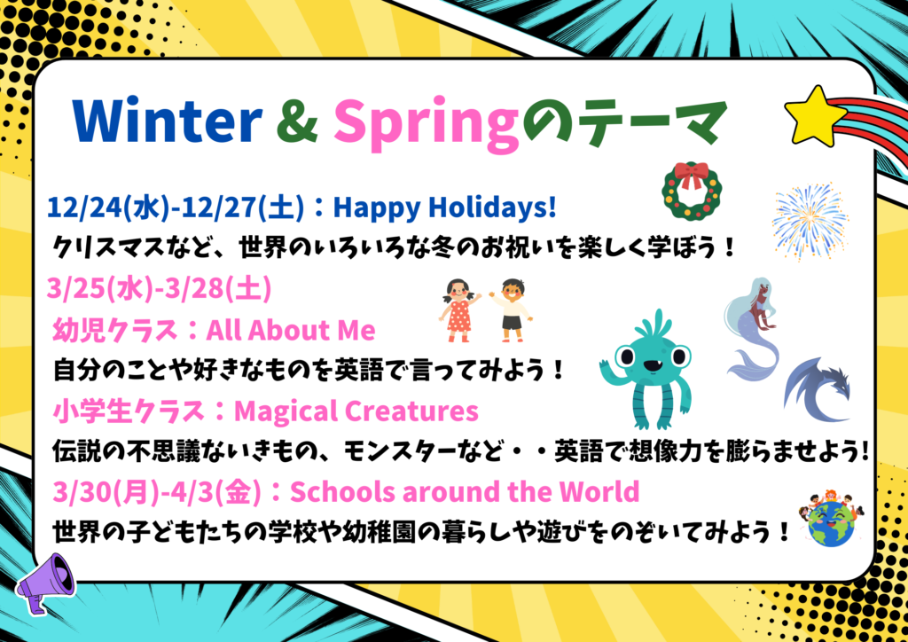 12月24日(水)~27日(土)(4日間) | 9:30~15:00 | 年中児・年長児 | 残席僅か | 38,000円 |