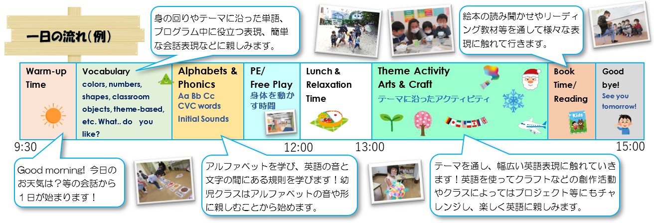 挨拶・身の回りの単語・フォニックス・リスニング・リーディング等の基礎的な英語スキルを学ぶことに加え、テーマアクティビティの時間には、身近で興味深いテーマを通して英語に親しんでいきます。その他にも、身体を動かす時間、クラフトなどもあり、楽しく学べることが盛りだくさんです!!