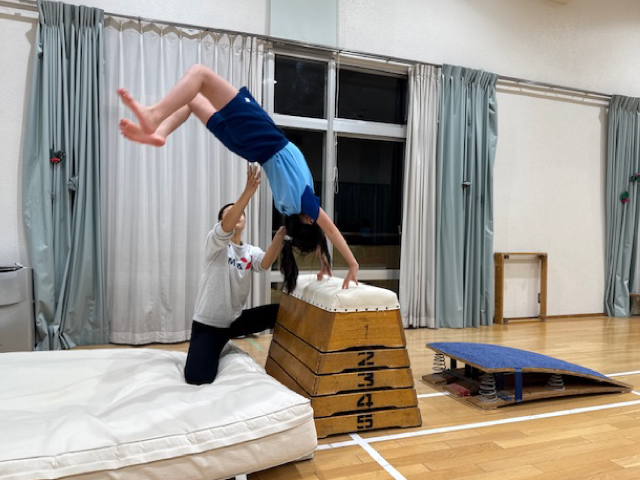 グループ練習を通して、ルールを守り、仲間と支え合いながら、マット・鉄棒・とび箱・トランポリンの基本の技の習得を目指します。はじめて技ができた時の感動は大きな自信となり、心とからだを成長させてくれます。